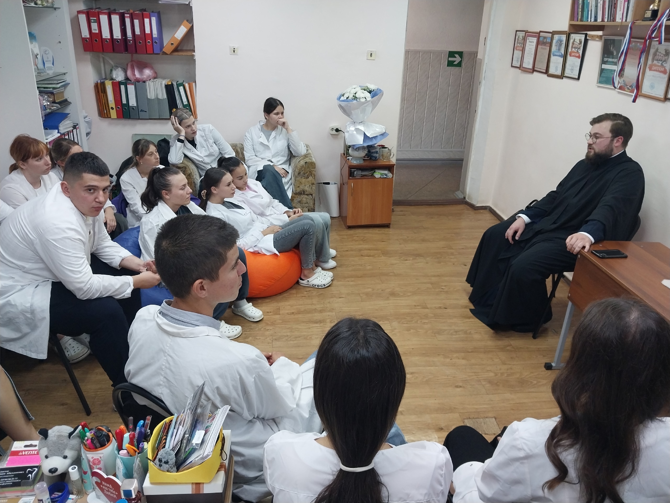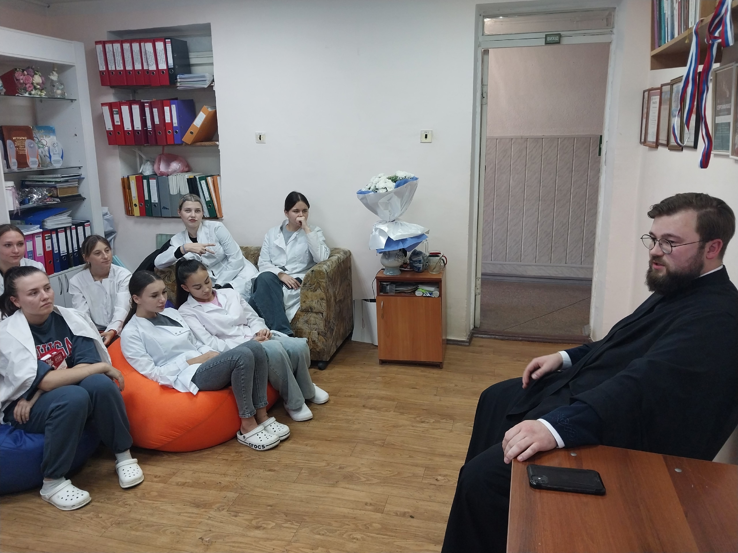 5 сентября клирик храма Трёх Святителей диакон Дионисий Голубцов провёл встречу с обучающимися Медицинского колледжа Ордена Трудового Красного Знамени Медицинского института им. С.И. Георгиевского