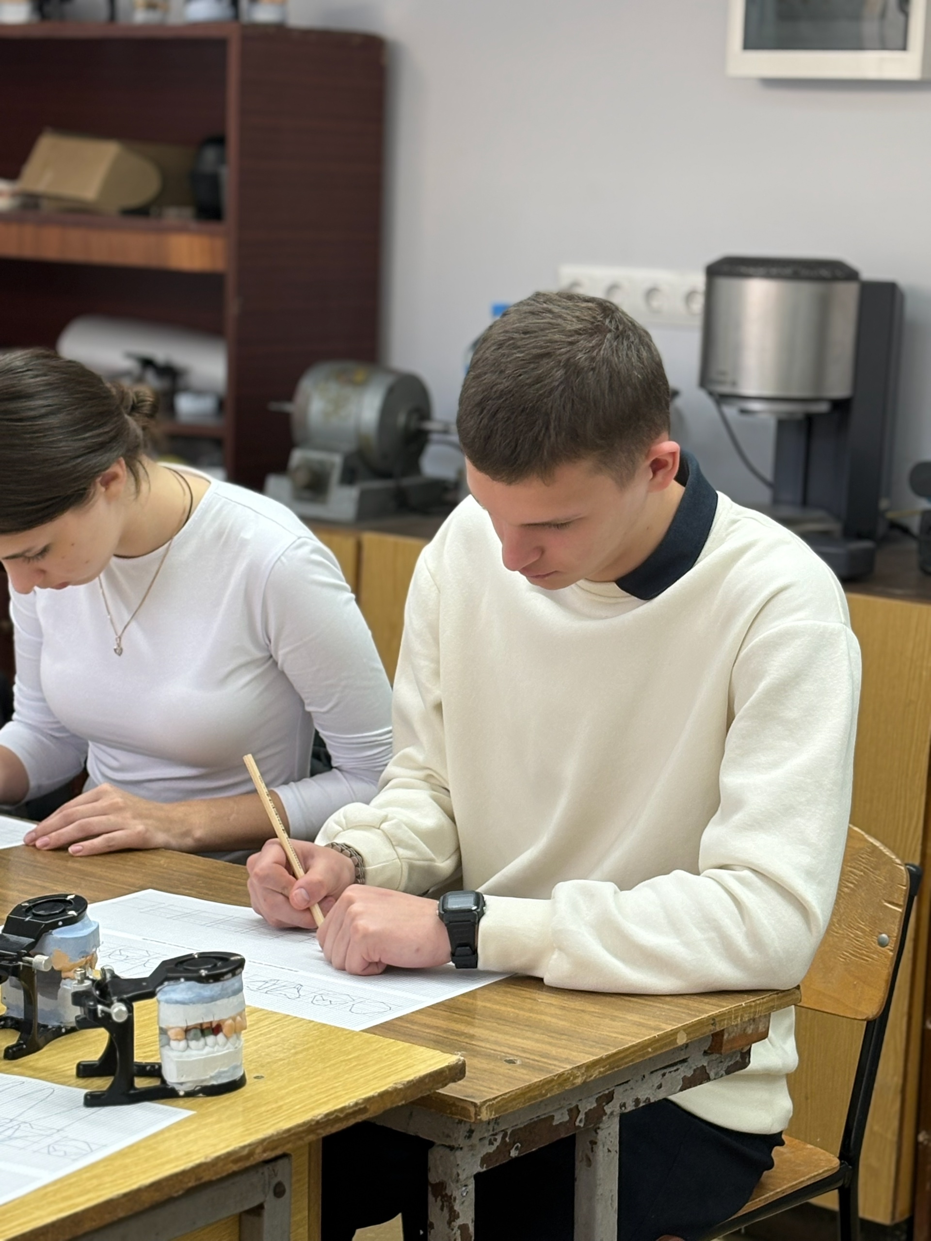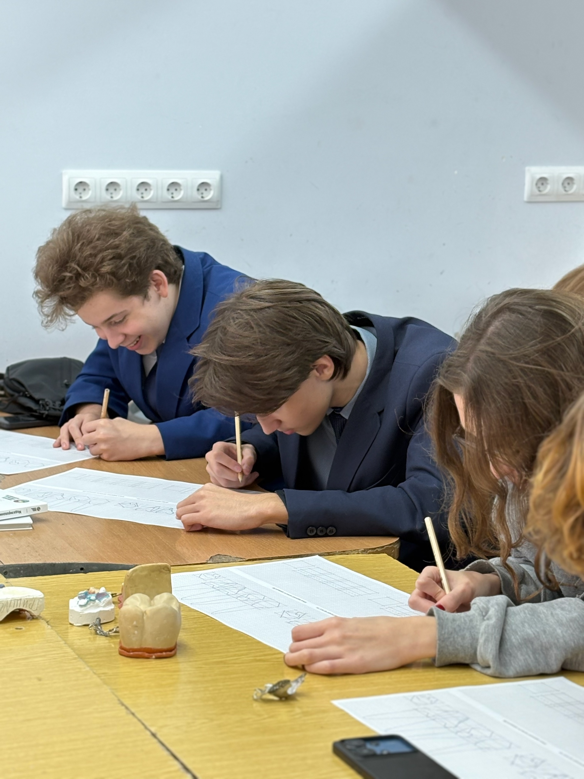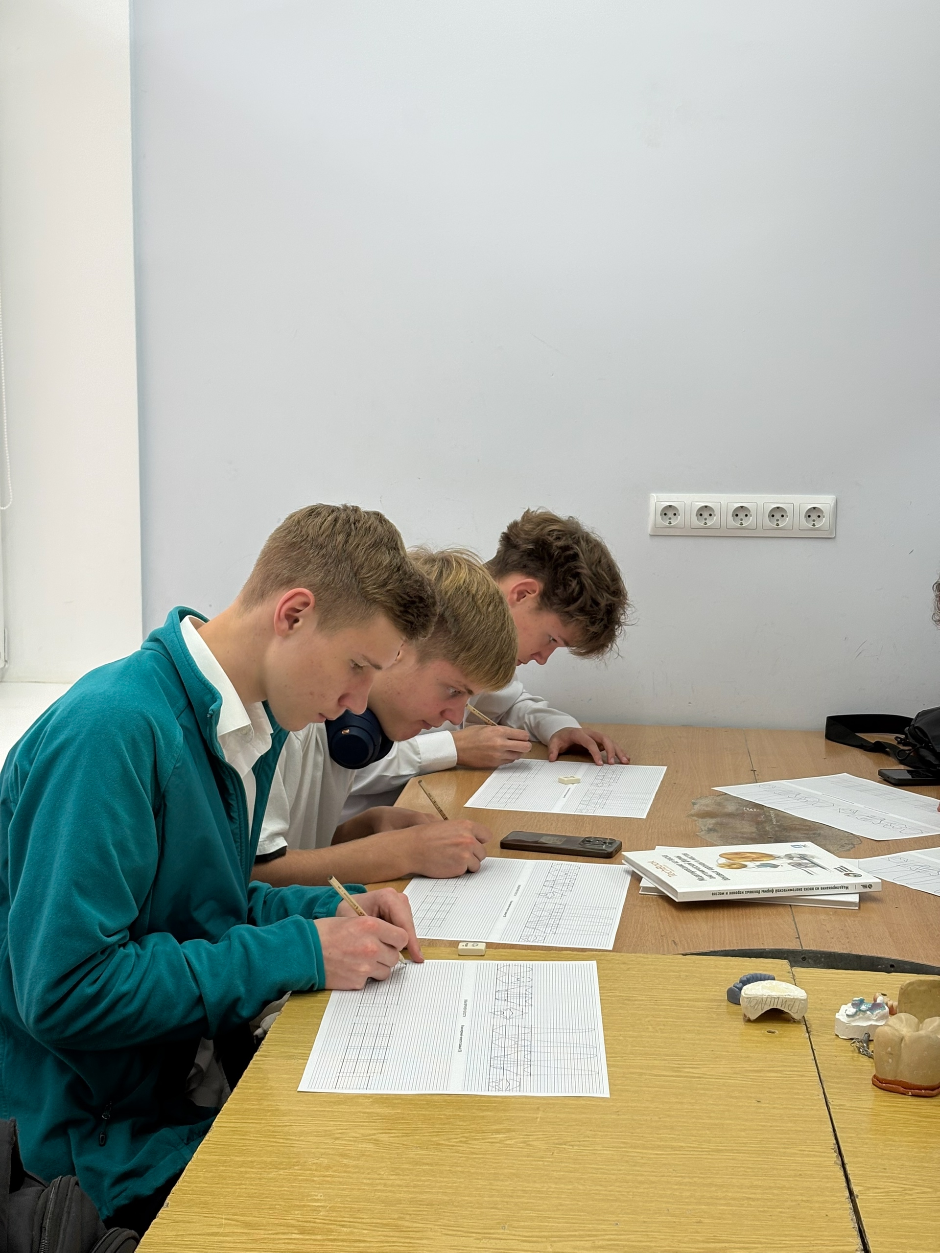 Под руководством преподавателей Зарубенко С.В. и Беширова М.А. обучающиеся школы выполнили задание: изучить строение правого клыка верхней челюсти и воспроизвели его изображение на шаблоне. С заданием все справились успешно!