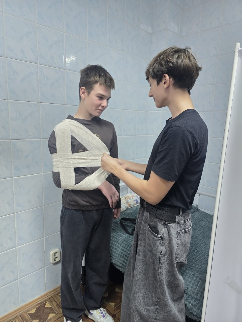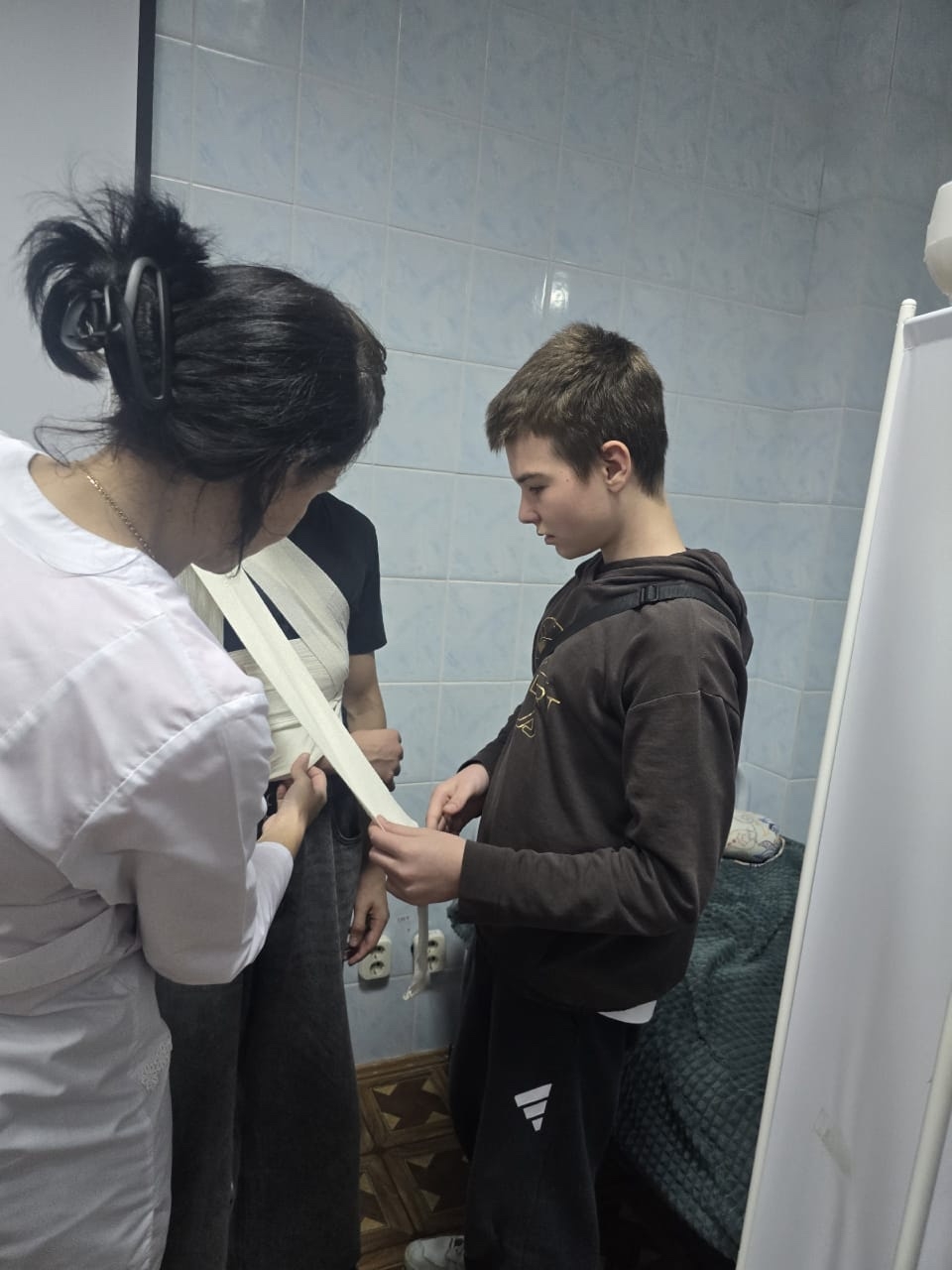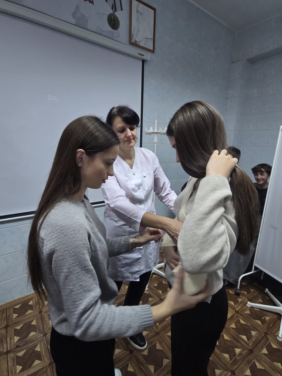 Преподаватели колледжа рассказали об алгоритме наложения повязки Дезо и предоставили возможность каждому обучающемуся попробовать себя в роли медицинского работника. Школьники проявили большой интерес и активность при проведении профессиональных проб, задавали интересующие вопросы.