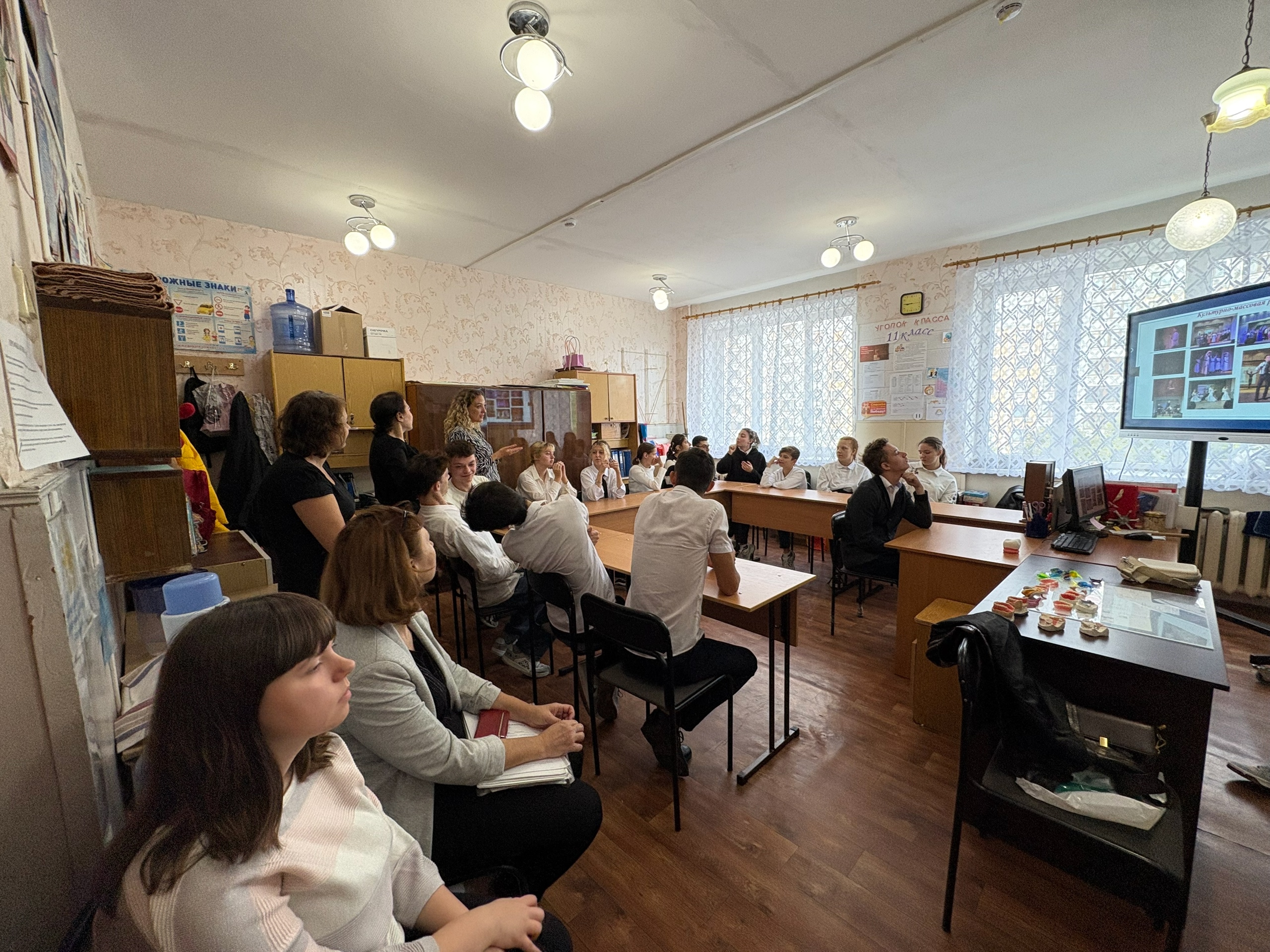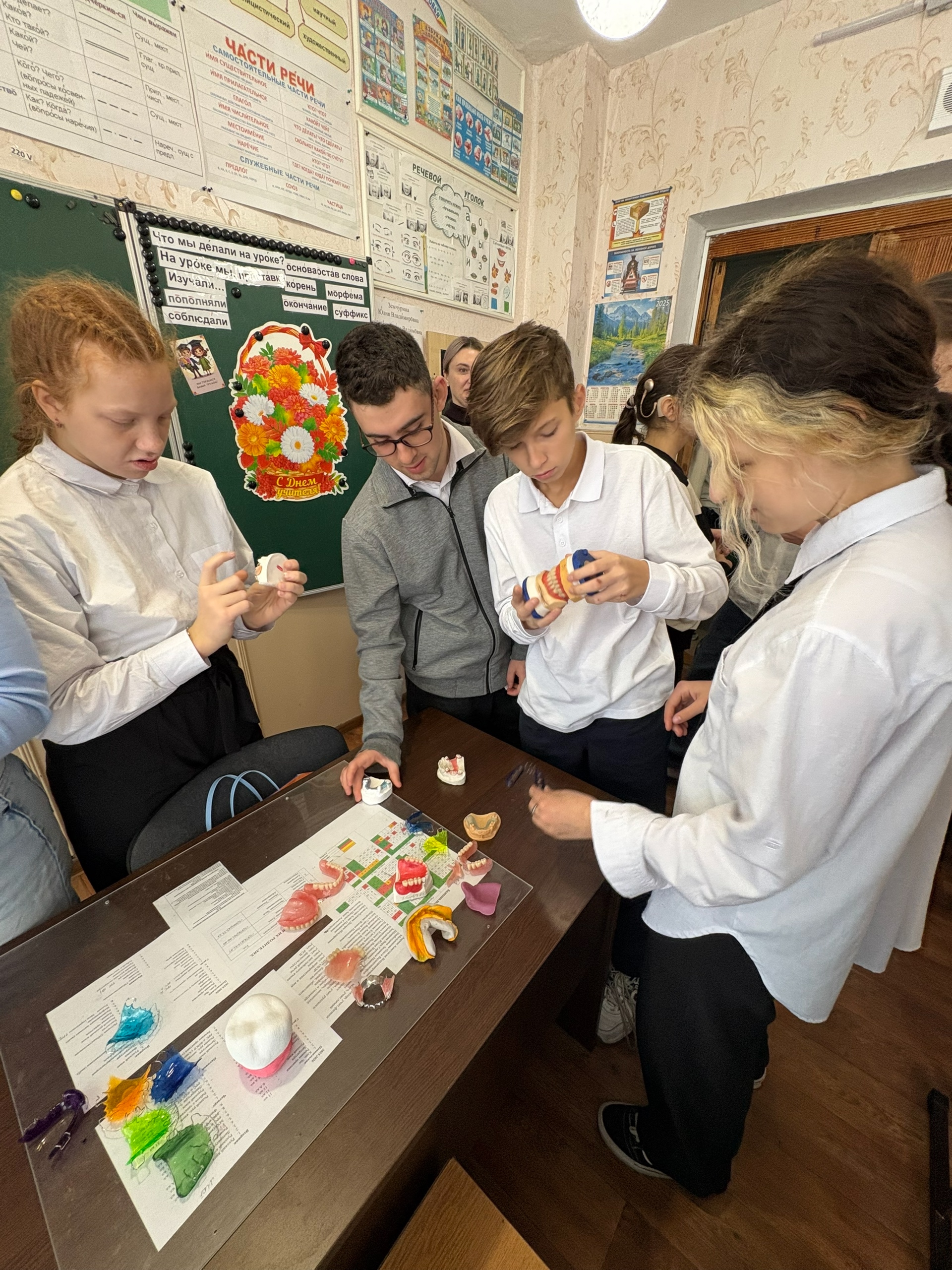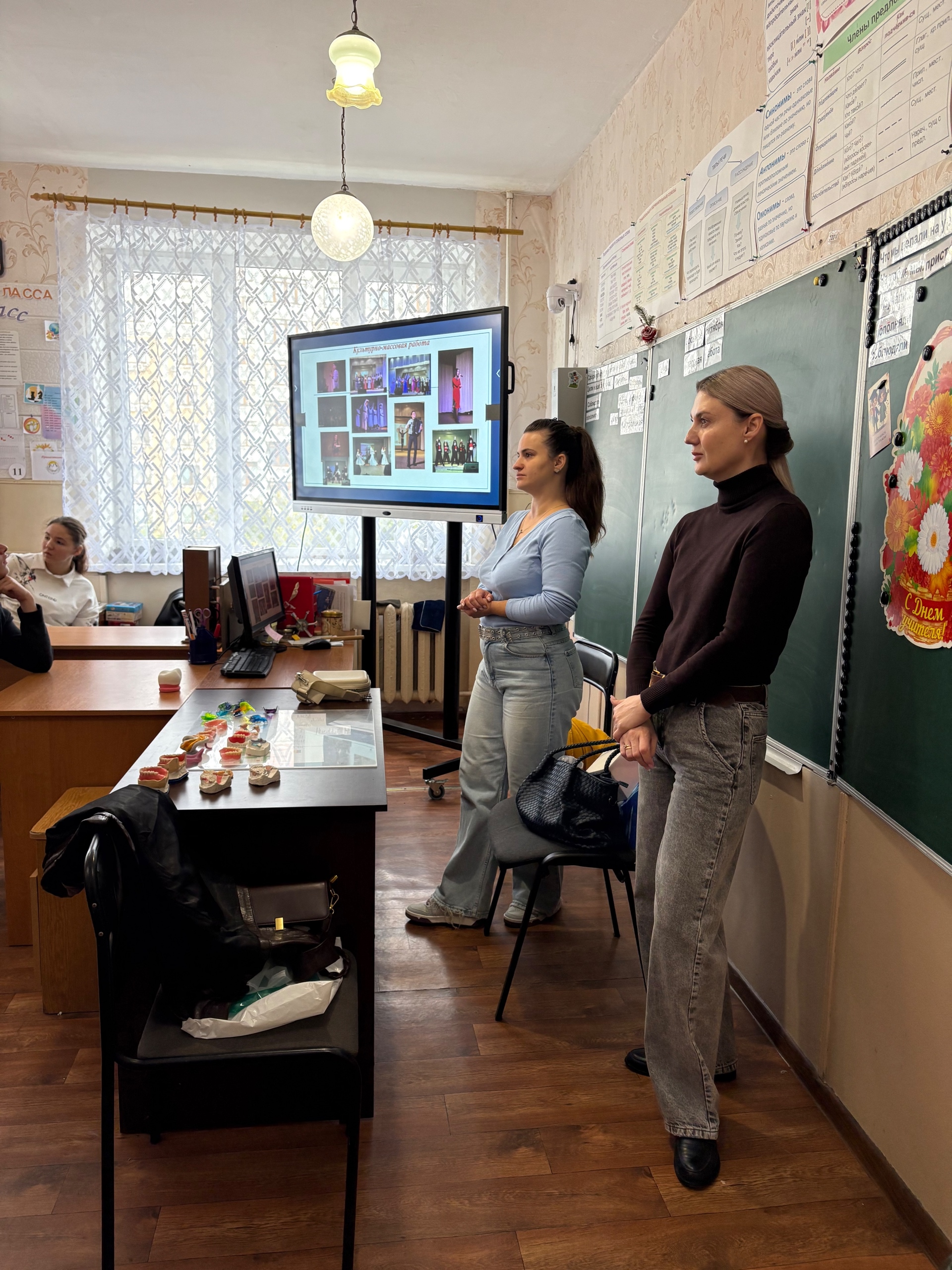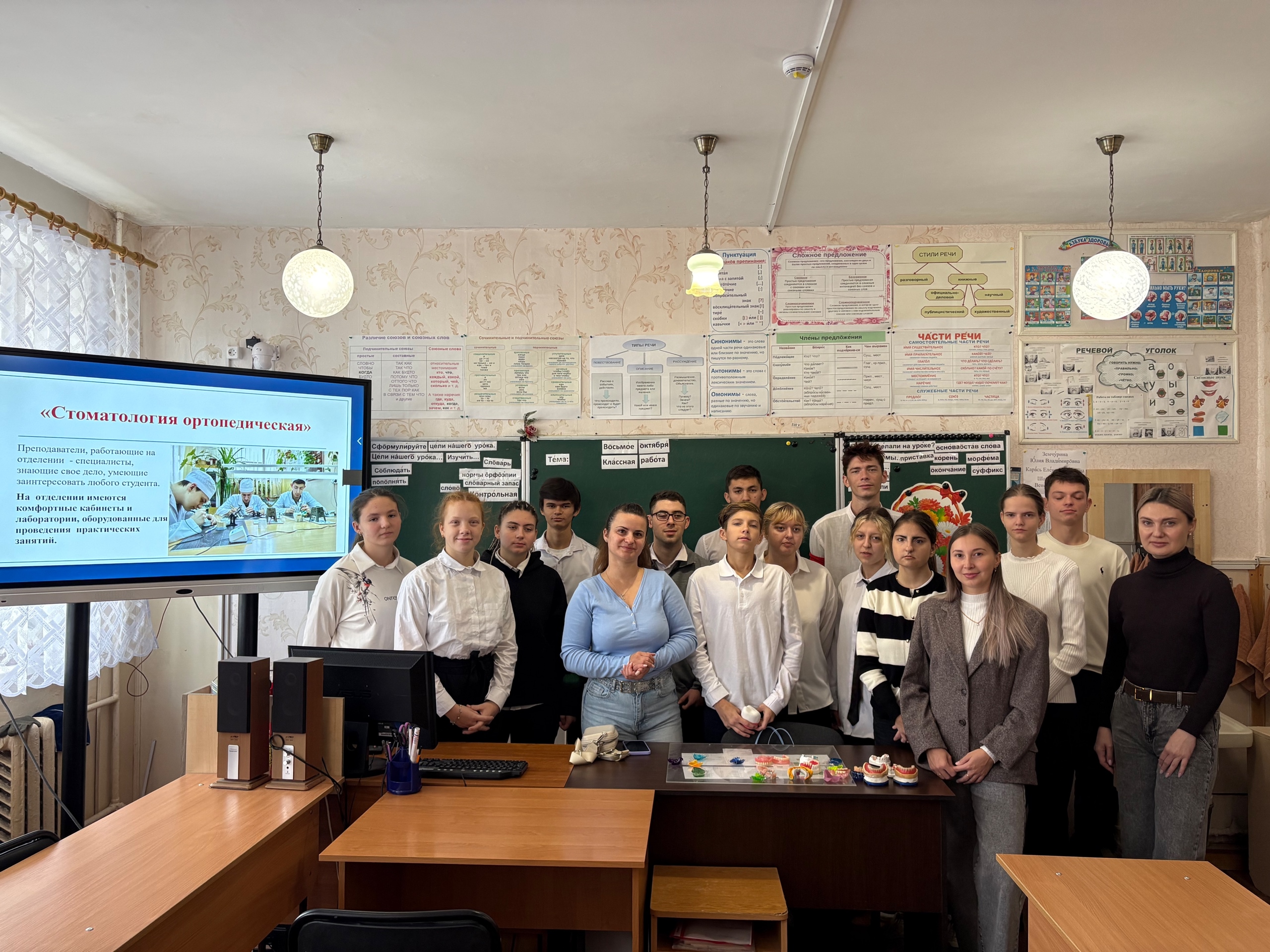 Преподаватели Сабинич В. А. и Никитченко С.И., сурдопереводчик Вознюк Е. А. и обучающаяся 2 курса отделения «Стоматология ортопедическая» Соколова Анастасия, которая так же обучалась в школе-интернат, рассказали будущим выпускникам школы об основных специальностях Медицинского колледжа, о важной и востребованной профессии — Зубной техник.