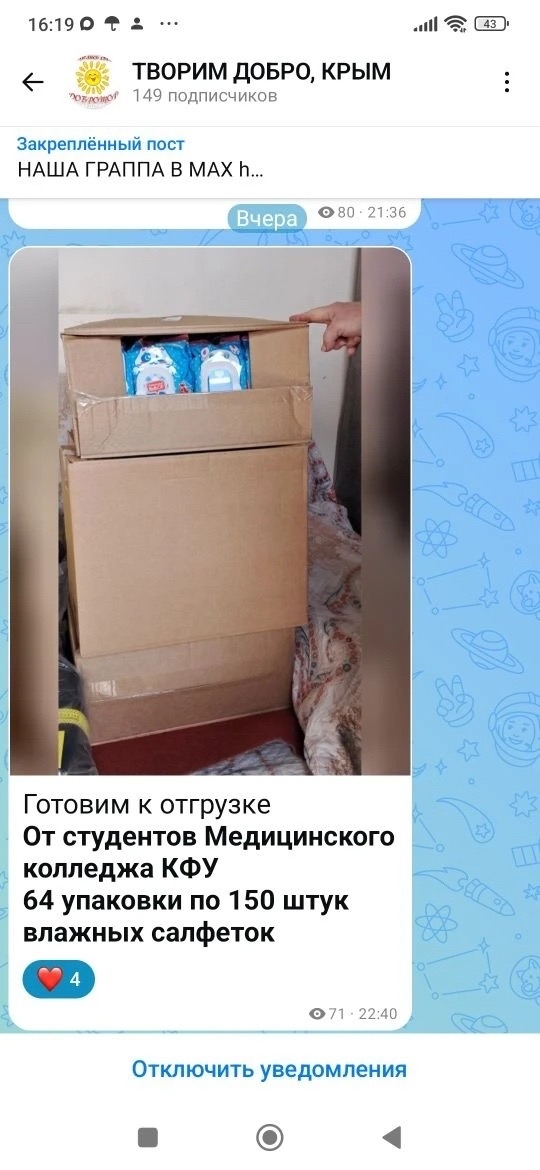 Обучающиеся Медицинского колледжа передали волонтерам группы «Творим добро» 65 упаковок по 150 штук влажных салфеток,27 подарочных наборов (в каждом наборе термоноски, сок и печенье), комплект постельного белья для бойцов, находящихся на передовой специальной военной операции.